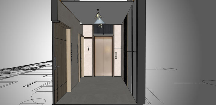 This is a modern and minimalistic elevator lobby. The space features clean lines and a neutral color palette dominated by light beige and cream tones. The floor and walls are covered with large, polished tiles that give the area a sleek and reflective surface.