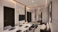 This modern entryway features a minimalist design with built-in storage cabinets, warm wood accents, and soft ambient lighting, creating a welcoming and elegant atmosphere.